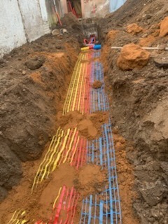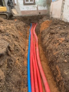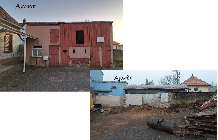 Les travaux ont commencé par la démolition d’une annexe existante, permettant de repenser les volumes et l’organisation du terrain. Une tranchée technique est également réalisée afin de relier les réseaux d’eau et d’électricité entre la maison principale et une grange située à proximité.